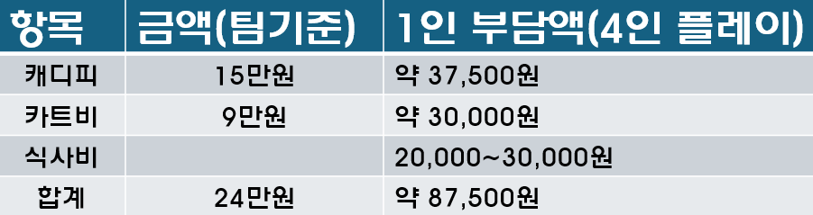 4명이서 라운딩하면 1인당 카트비 3만 원, 캐디피 3만 7,500원이 붙어서 총 6만 7,500원이 추가됩니다.