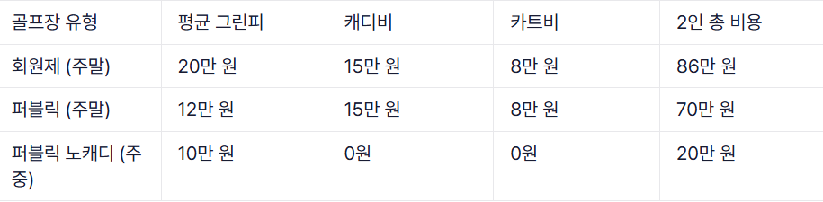 2인 기준으로 4만~8만 원이면 충분합니다. 실제 필드 그린피의 1/5 수준이죠.