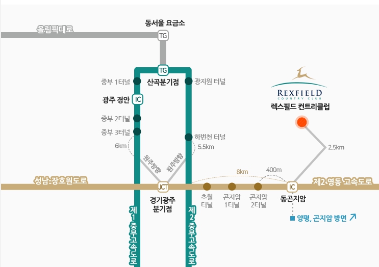 동서울 TG 진입 → 제 1,2 중부고속도로 → 경기광주분기점 (원주방향) → 동곤지암 IC → 렉스필드