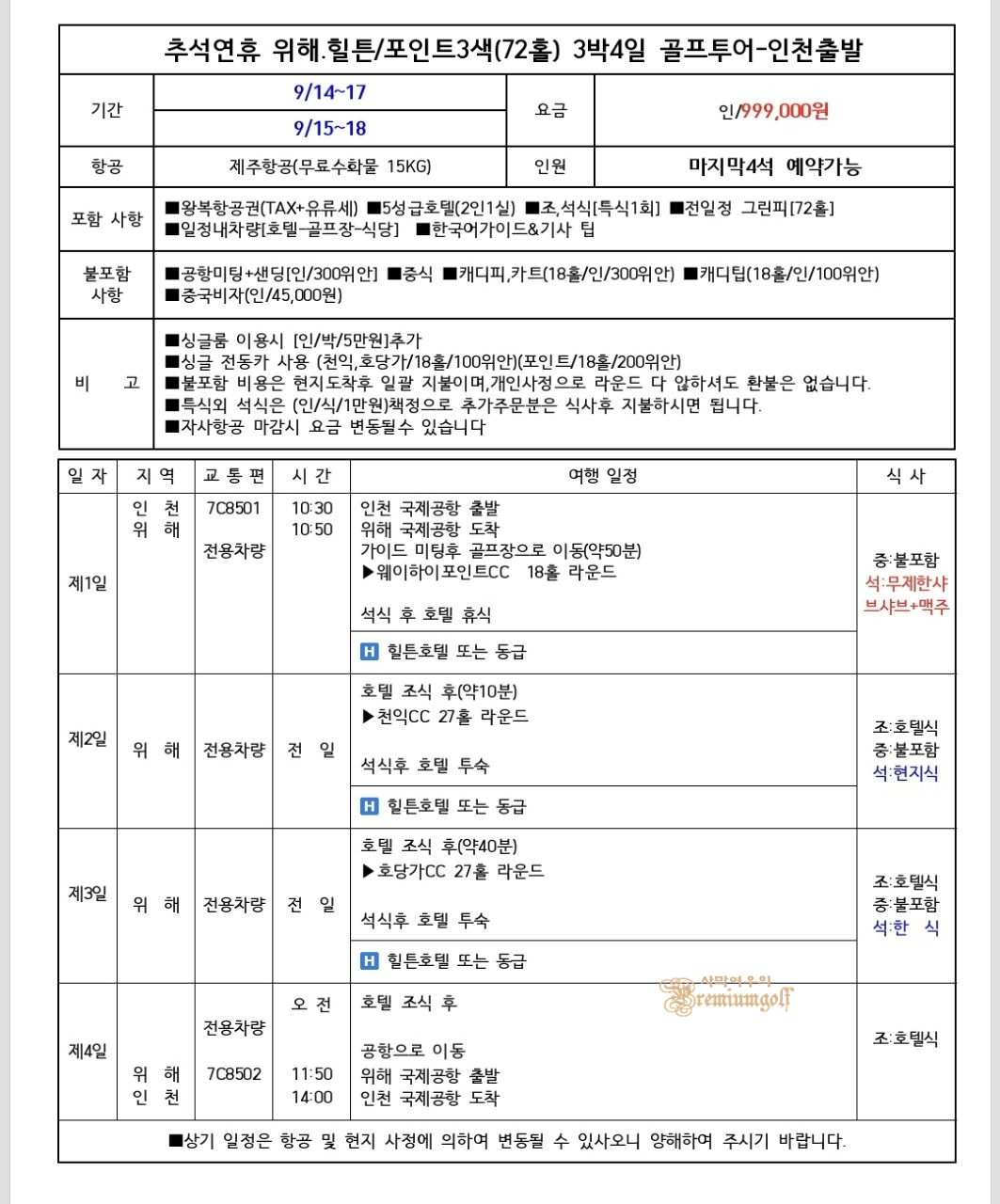 ⛳힐튼호텔"웨이하이포인트3색"(3박4일)72홀