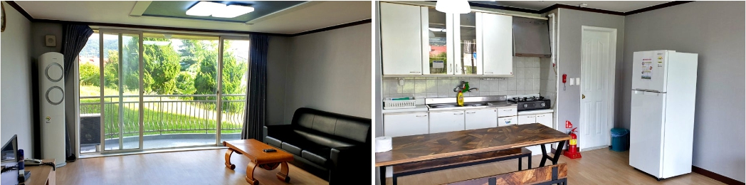 객실 내 시설 : 가스레인지, 냉장고, 쇼파, 식탁, 에어컨, 전기밥솥, 취사도구, 타월, TV, 화장실