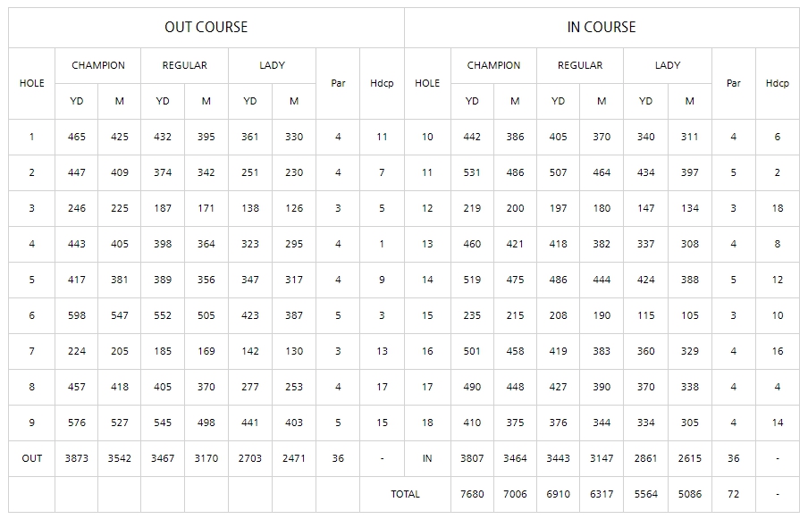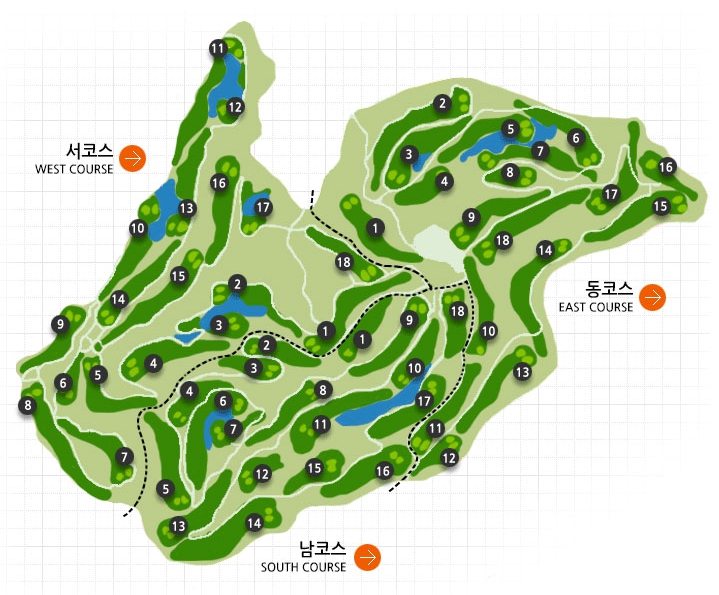 코 스 | 회원제 : 서코스 (18홀), 퍼블릭 : 동코스, 남코스 각 18홀 | |