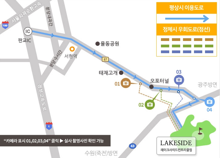 판교IC - 분당 시범단지아파트 - 율동공원 - 태재고개 - 오포터널 - 43번국도 수지방향 - 레이크사이드CC